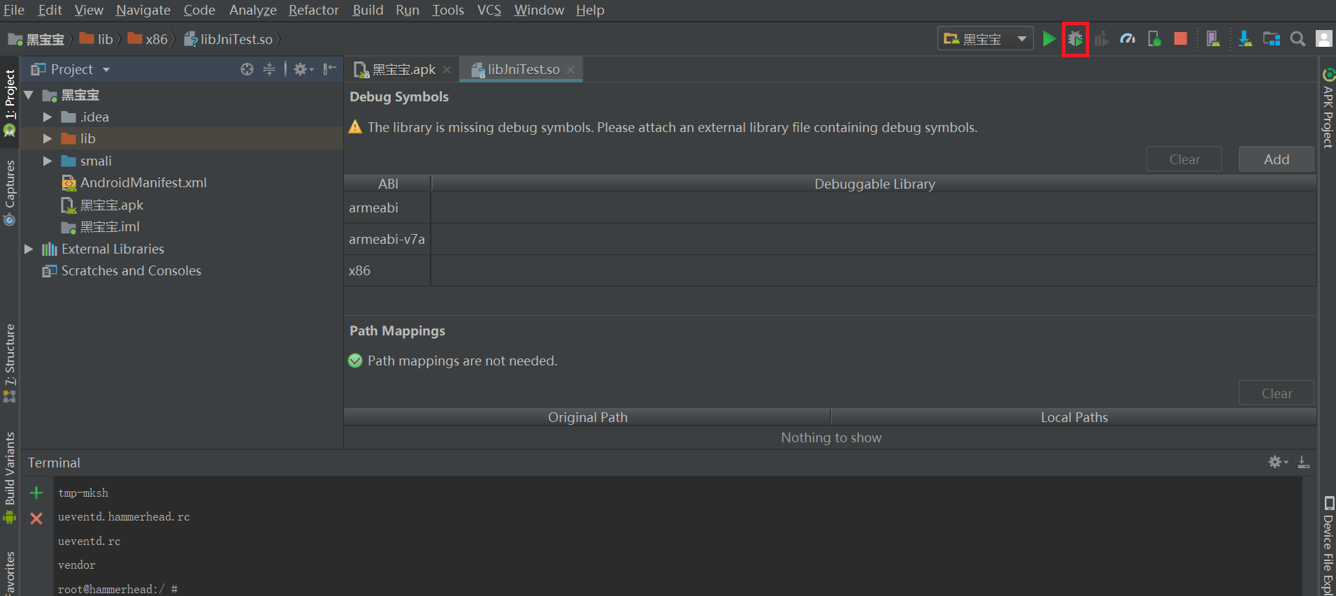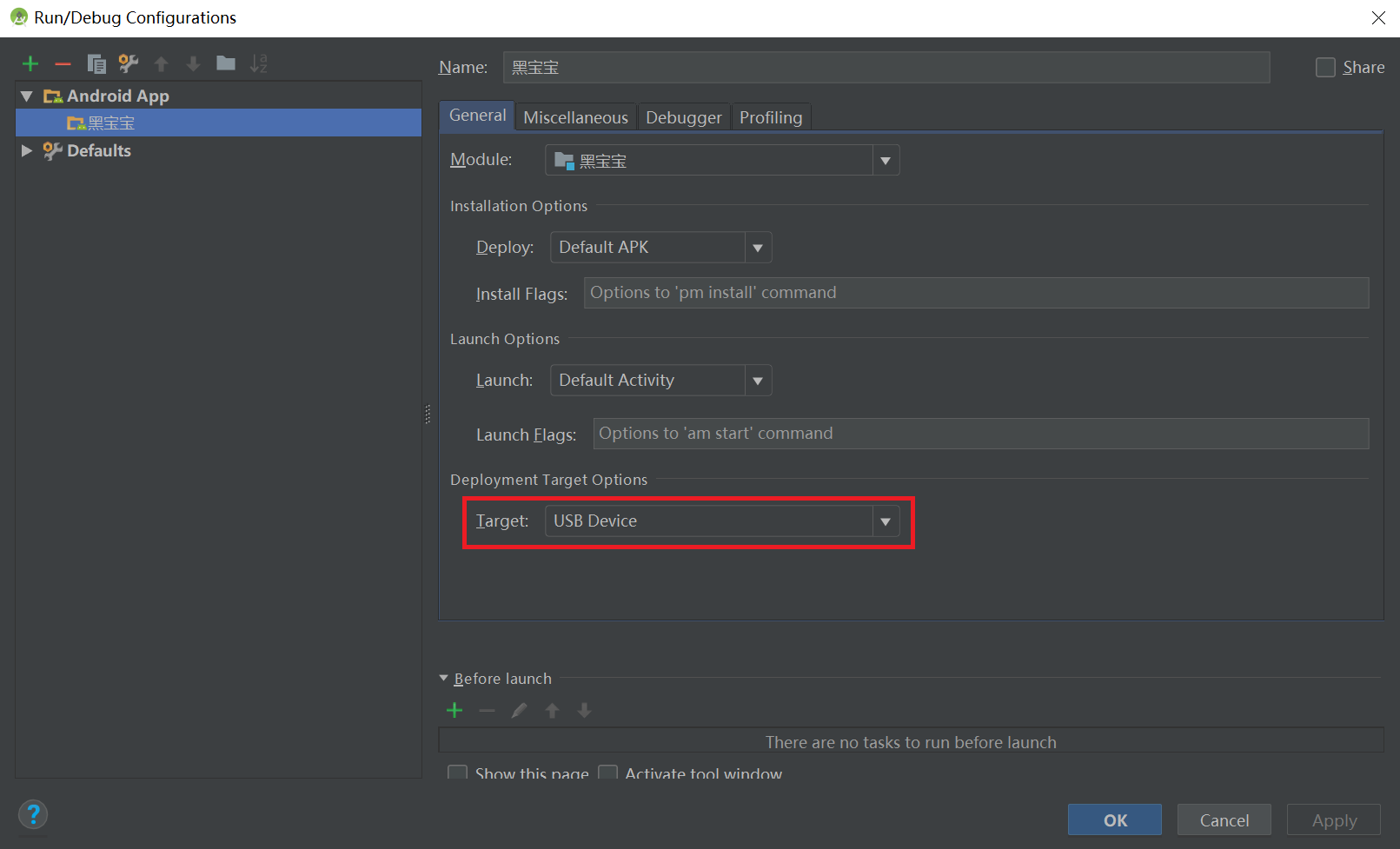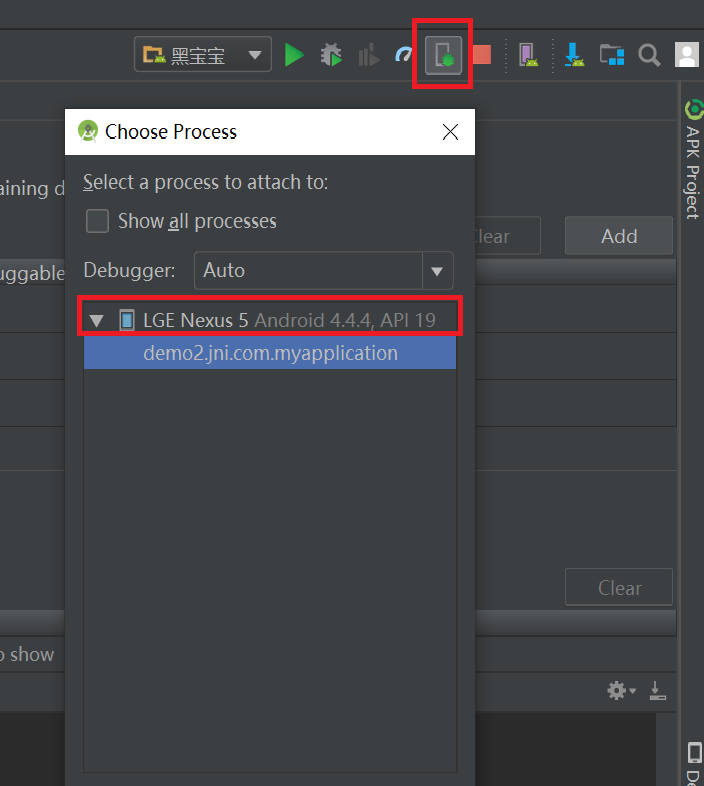 然后点击下图红框框中的按钮, 就可以直接将apk安装到真机上并且直接运行了, 快乐。