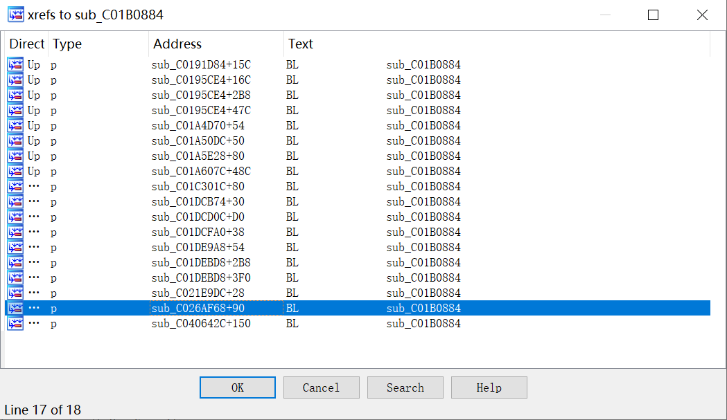 之后点击函数名c01b0884(__task_pid_nr_ns函数), 按下快捷键X, 会弹出交叉引用, 在其中查找我们上面找的第二个函数c02ba04c( proc_pid_status)的位置。