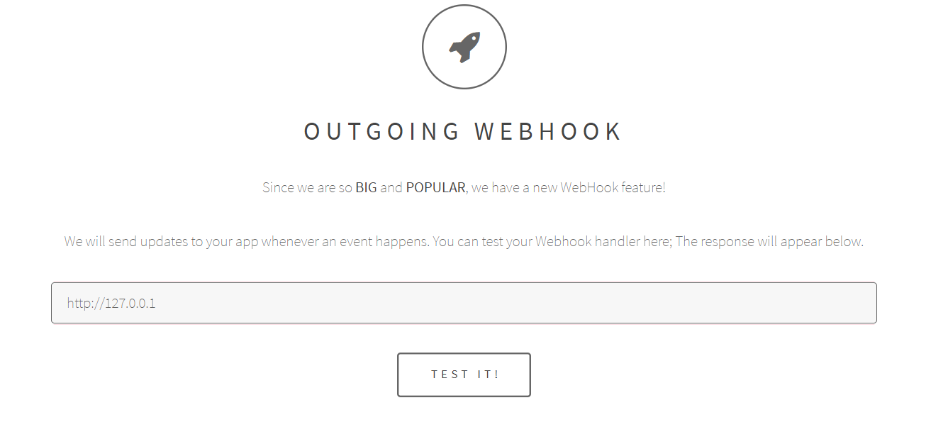 打开页面,OUTGOING WEBHOOK部分输入的https://yourhandler.io/events是有REST API监听的需要测试项目,在SEE THE RESULT的部分会显示请求响应的结果和状态码。输入https://yourhandler.io/events的位置就可以作为一个测试点。