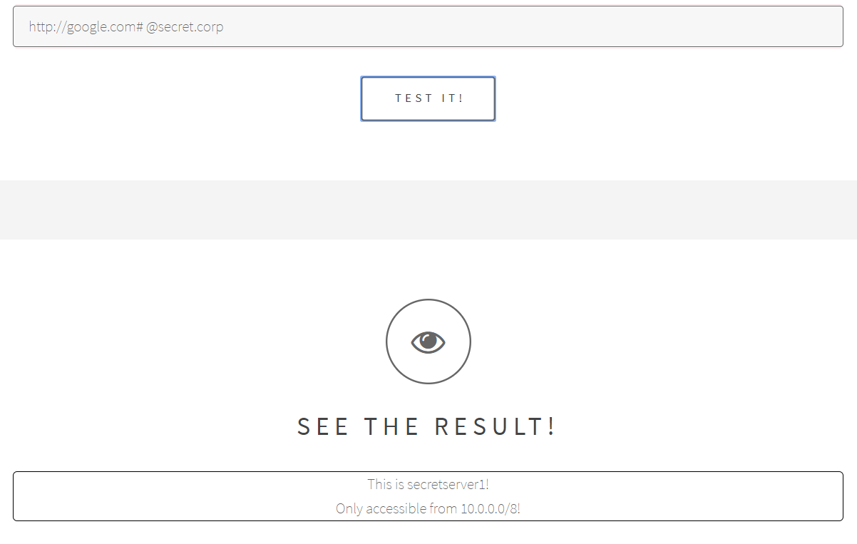URL解析器分析出这部分内容是访问已被限制的域,下面要介绍一个新的知识点了,我们先来测试一下它能不能起作用。在测试点输入http://google.com# @secret.corp