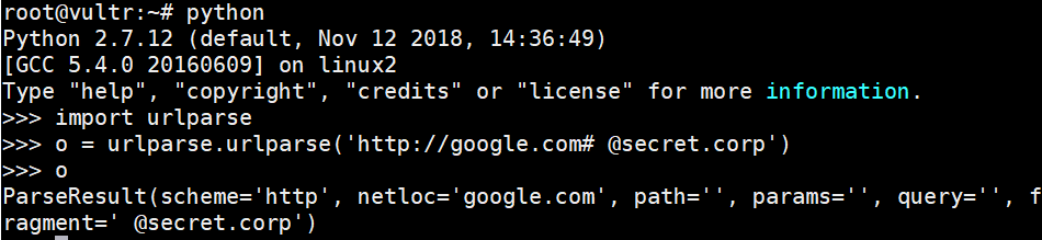 为了进一步阐述上面漏洞利用的原理,用python写几行代码来验证一下,如果有点混乱,可以再看看上面的源代码,用urlparse解析URL进行判断是先于调用urllib发出请求的。下图为urlparse解析的结果,在python2.7和python3.5两个版本中都是一致的