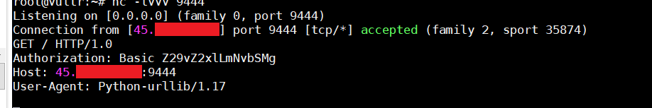 为了能够进一步验证urllib能否正确接收到,在VPS上输入命令nc -lvvv 9444监听本地9444端口,再按照下面命令通过python发送请求:1